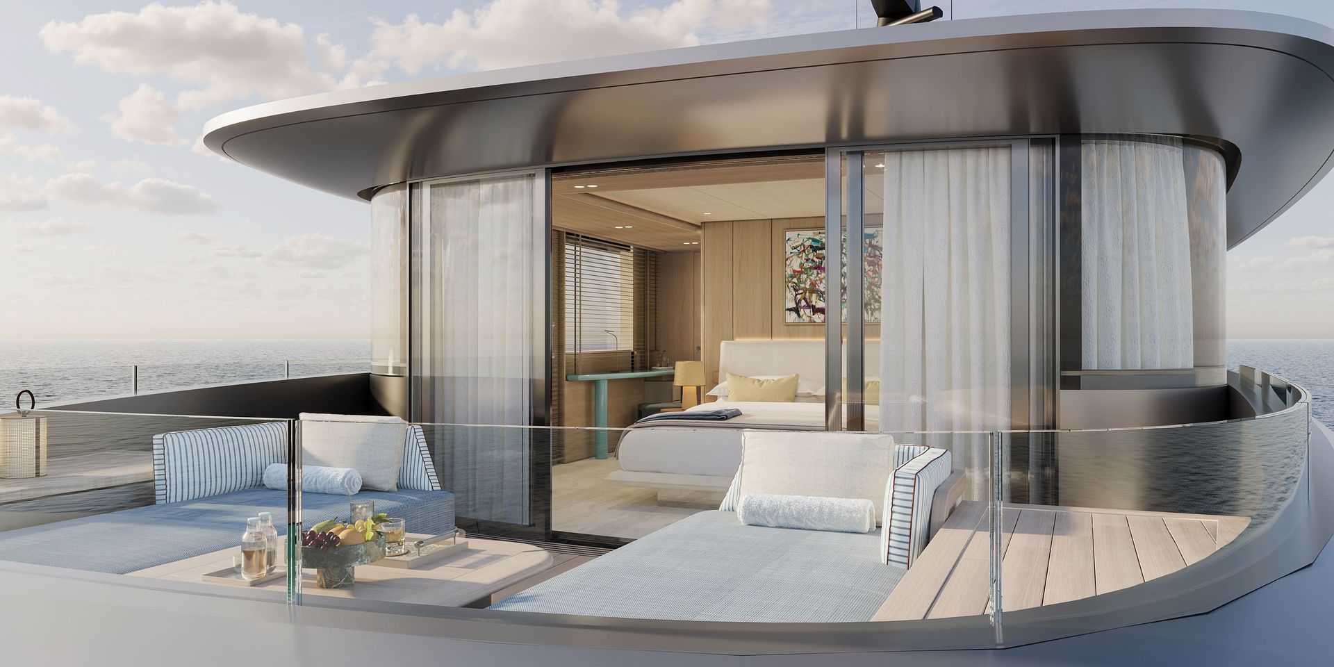 Inside, Francesca Muzio (FM Architettura) delivers interiors that feel lived-in rather than monumental. Lightness, warm materials, tactile finishes and welcoming spaces replace formality and excess. The focus shifts from display to comfort — the purpose is to enjoy the yacht through family-oriented spaces. A return to what truly matters. A simplicity that elevates the overall experience.