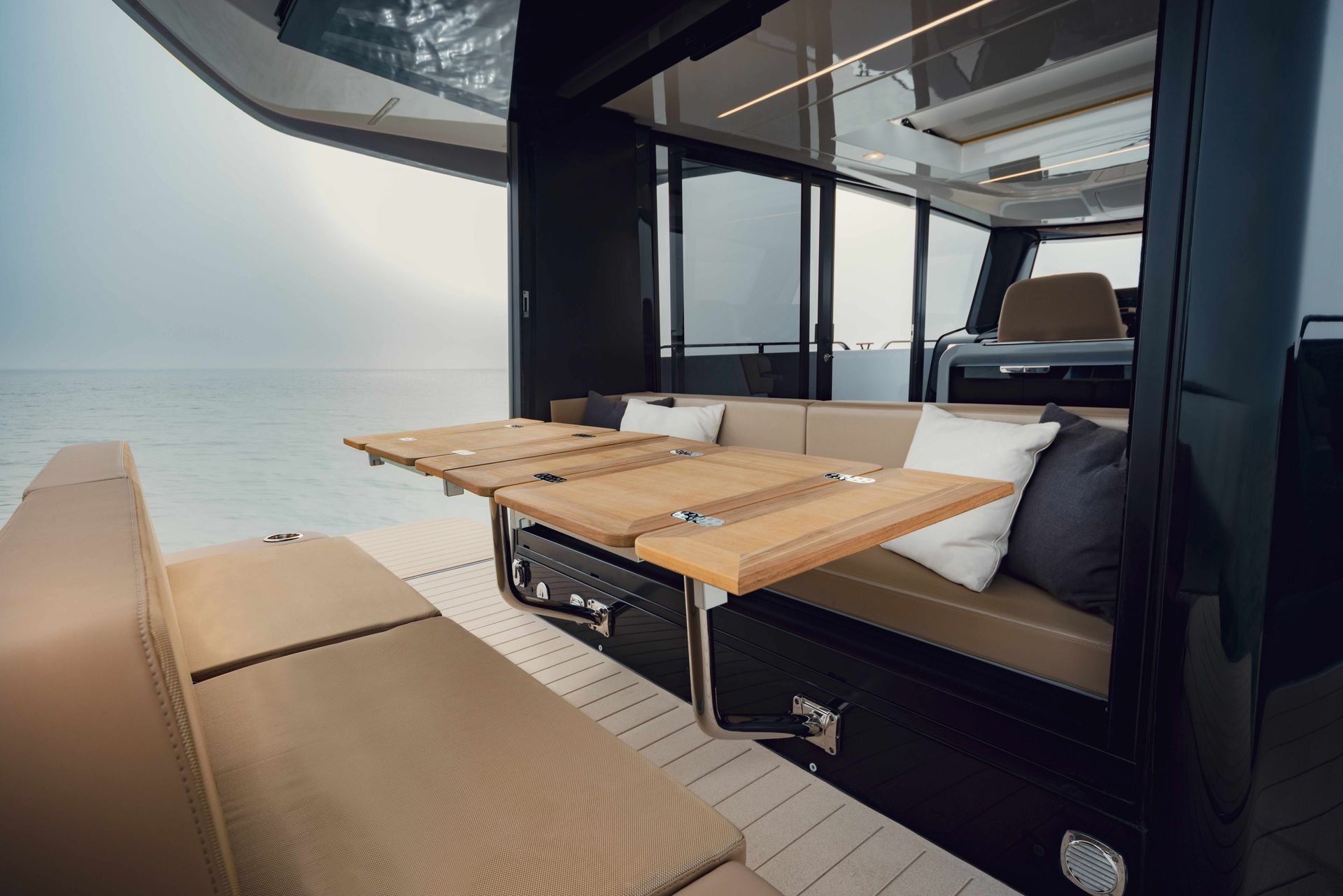Fold-down side terraces allow the cockpit to transform into a flexible open-space layout with multiple configurations. The large sunpad features a reclining backrest that can face the spacious dinette, where an extendable table accommodates numerous guests. A second sofa completes the area and can be enclosed by the sliding glass panels. Depending on the backrest configuration, it also forms seating for a second sheltered social space equipped with two individual armchairs and an additional table. This entire living area is served by a fully equipped bar unit with a galley corner, sink and refrigerator, located aft of the helm and co-helm seats and facing the futuristic helm station.