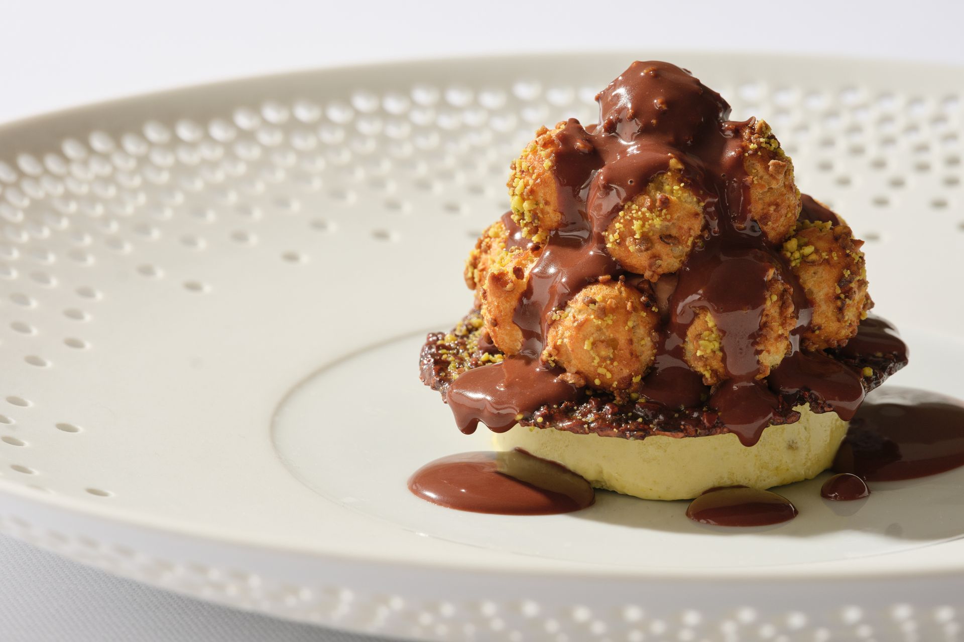 The experience culminates with a dessert that travels directly from Capri to London. Profiteroles filled with chocolate cream and pistachio provide a final flourish, taken from L’Olivo’s own dessert repertoire and created by legendary pastry chef Pierre Hermé. It is a closing note that reinforces the residency’s sense of occasion, blending indulgence with immaculate technique.