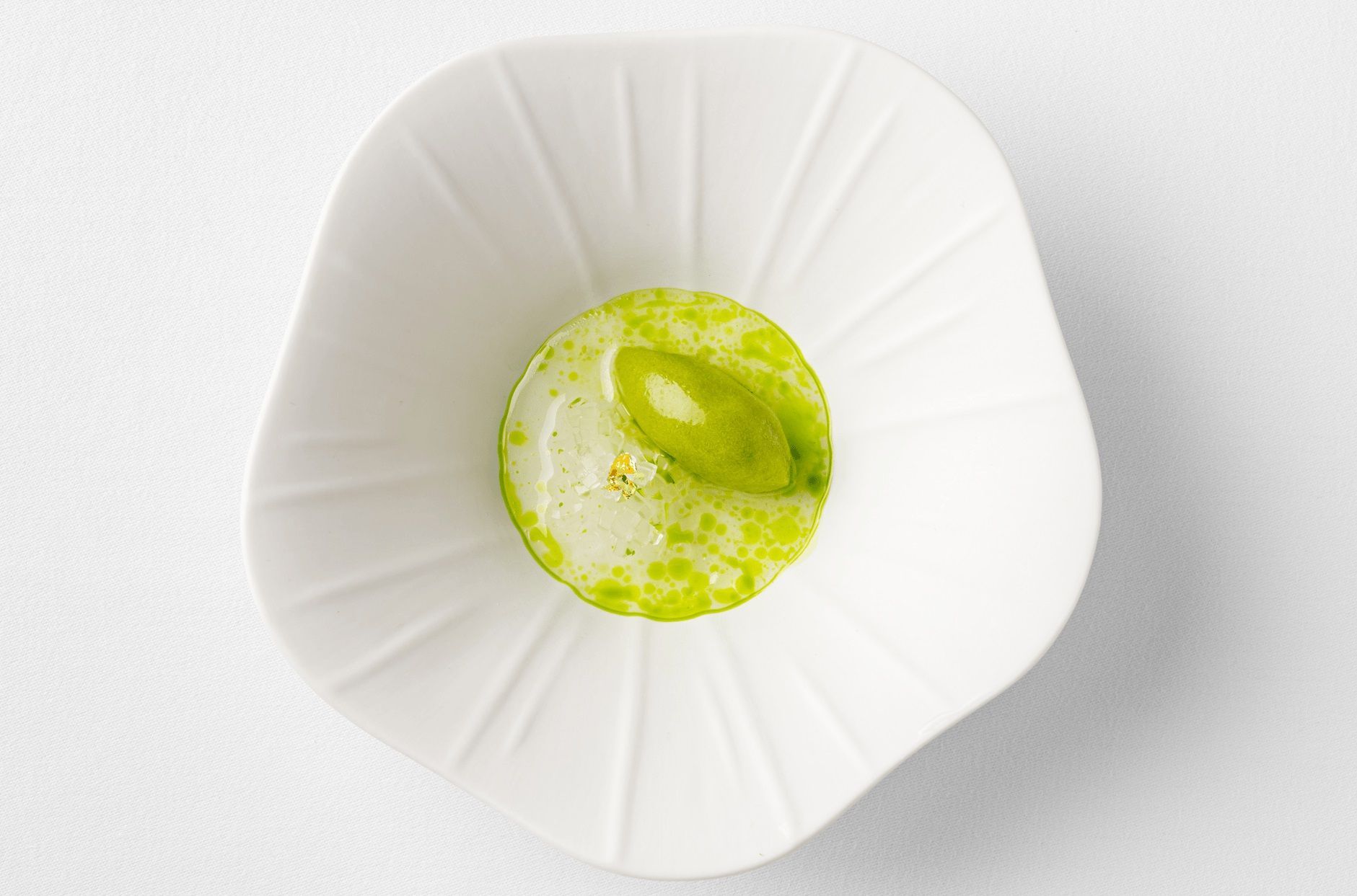 Minotti reimagines this classic French interlude as lovage sorbet atop galanga-infused jelly, with Green Chartreuse poured ceremonially. "The balance is intentional: the flavours of the liqueur are enhanced without the sensation of alcohol, whilst lovage and galangal bring freshness, minerality, and acidity."