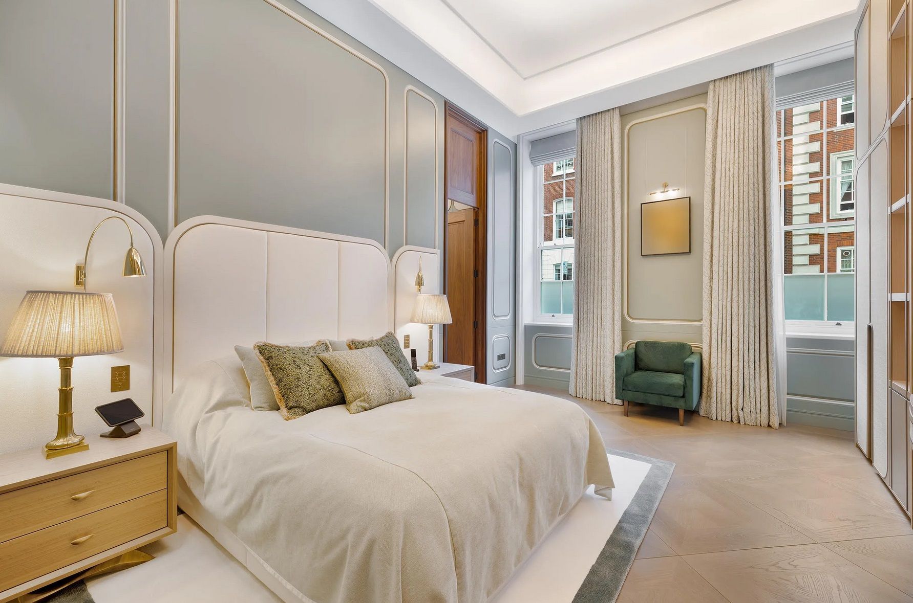 The principal suite occupies its own discreet wing on the ground floor, overlooking the square with a calm, almost contemplative outlook. It is a space designed for retreat as much as rest, complete with an expansive dressing room and a marble-clad bathroom that speaks to quiet indulgence. Twin basins, a walk-in shower and a deep bathtub are all present, but it is the harmony of materials and the sense of privacy that truly define the experience.